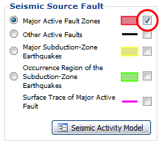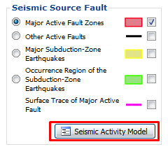 You can select an earthquake type using the "Classfication of Earthquakes" combobox. When selected classfication is changed, the corresponding seismic source faults will be selected.