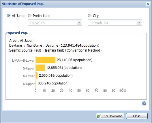 The graph shows exposed population and its ratio to whole population for each threshold of JMA seismic intensity.