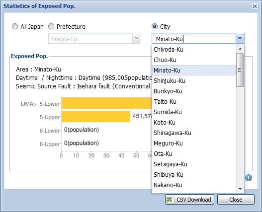 For example, to see the statistics of "Minato-ku, Tokyo", select "City" from the radio button and then "Tokyo-To"->"Minato-Ku" from the combobox.