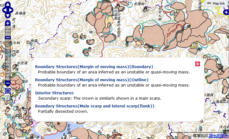 When zoom level is 10 or more, landslide symbols appear on the map. Click a landslide symbol, the landslide property appears.