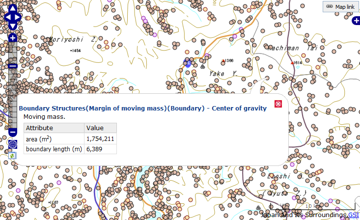 When zoom level is 9 or less, centroid positions of the moving mass appear on the map. Click a centroid position, the landslide property appears.