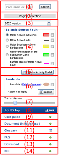 - Click to open a glossary window for the J-SHIS. You can read an explanation of each earthquake category.